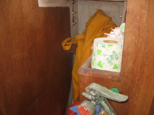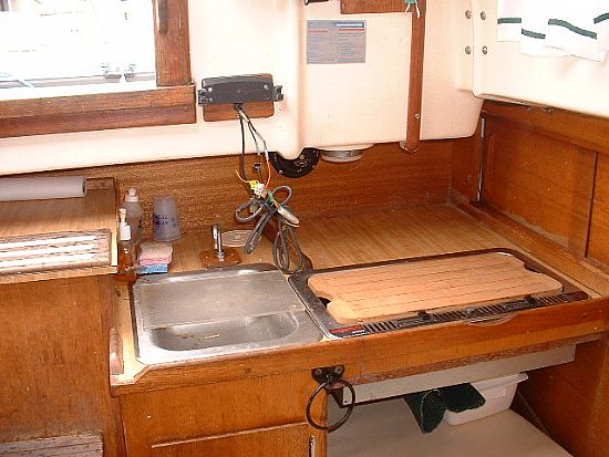 - Icebox door (with chain restrainer) forms shelf. Dish, package storage galley counter racks and shelf over icebox. Icebox drains overboard.