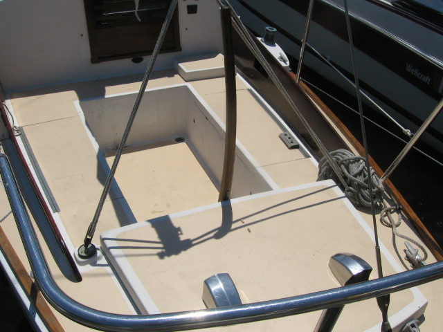 Exact reasons for this hatch’s design change isn’t known. Likely the change was to reduce chance of water ingress, since a raised flange is more waterproof. One downside of this design change is that a raised flange presents a tripping hazard and somewhat blocks a good seating spot for crew. Generally, this hatch isn’t very seaworthy, as it’s installed far outboard on the boat and the hatches weren’t designed to be battened down. Also, adding a second hatch to the icebox makes it inefficient. Over time, many Bristol 27 owners permanently sealed off exterior icebox hatches due to these concerns.