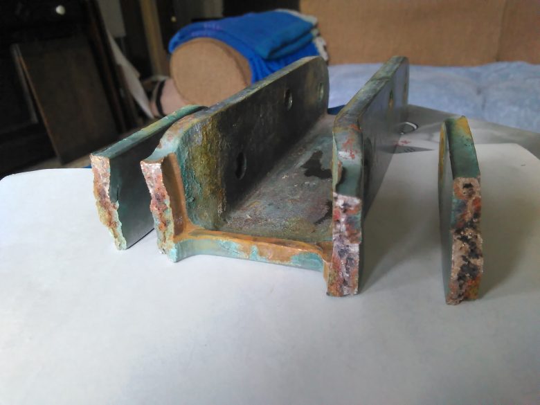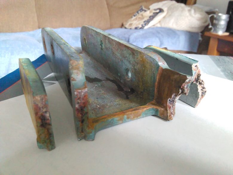 October 3, 2018 – We were sailing into Bullock Cove Sunday afternoon, last sail of the season, nice broad reach but a very narrow channel with plenty of powerboat traffic, when the tiller failed. Attached are pictures of the failure point. Vise grips on the rudder head, and teamwork, got us back to the dock. Here’s an image of the break: