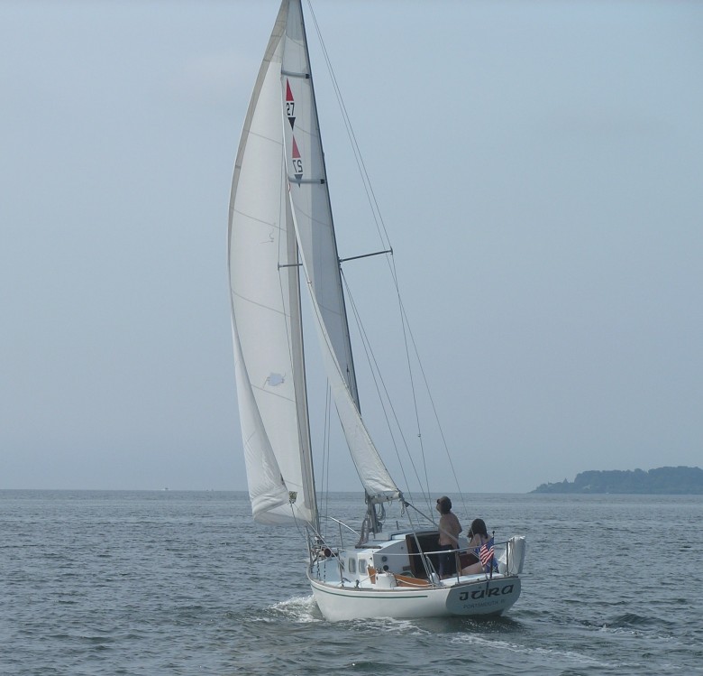 August 3, 2011 – We went out last night, my son and I, and got caught in a squall off Black Point in the Sakonnet. Roller furling is great, but the sail shape when partly furled is terrible, as you know. Still did five knots, with one reef and just a bit of jib showing. We had a second reef point sewn into the main two years ago; only used it once so far. Over the years, someone took a lot of hardware off the boom, so I’m having to re-rig the outhaul gear.