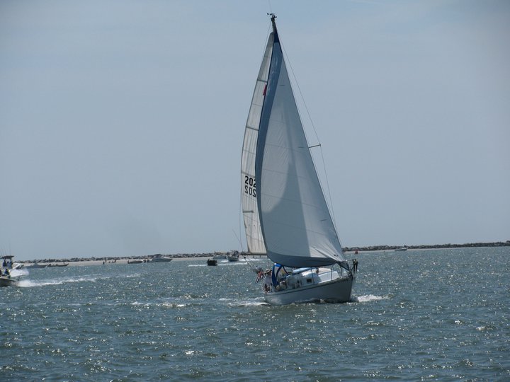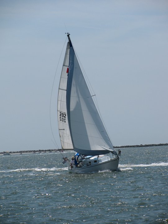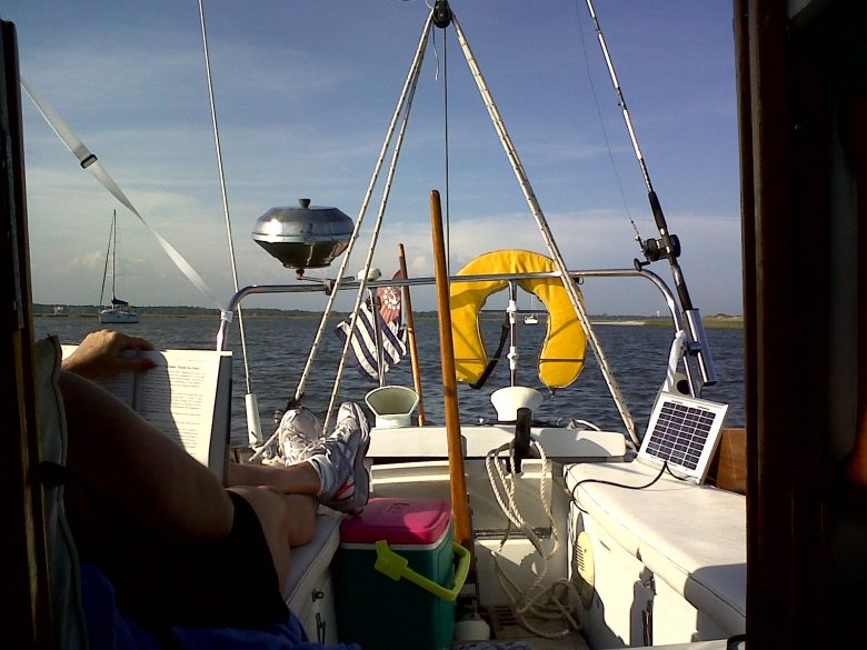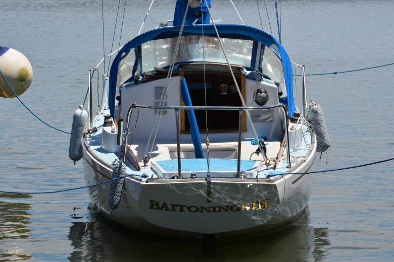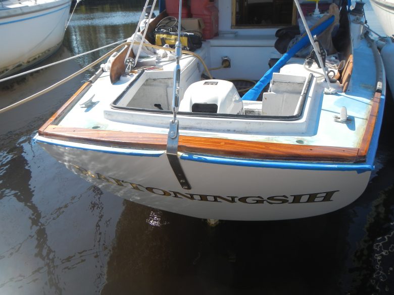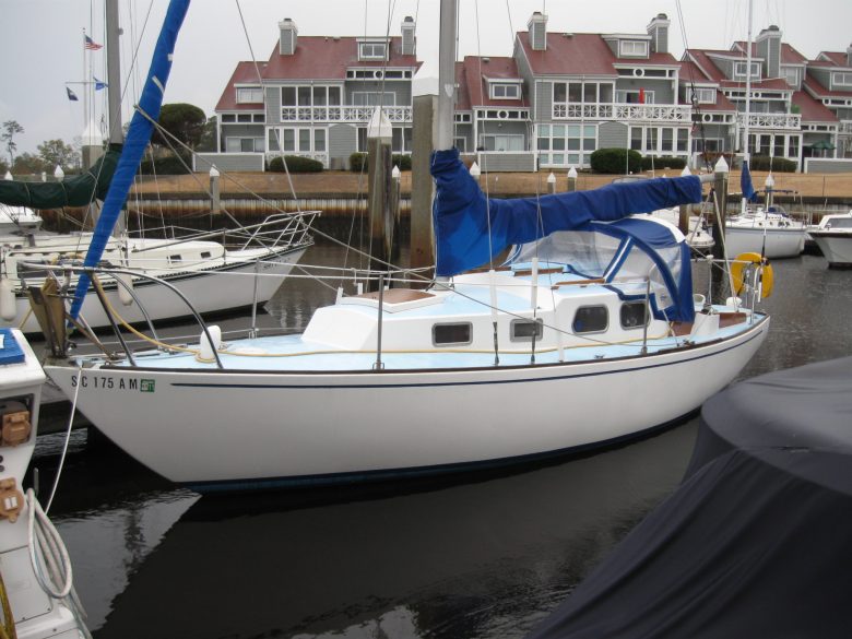 August 6, 2011 – She has a 9.8 Nissan 4 stroke in the well, XL shaft. She previously had a Yamaha 15 4 stroke long shaft (slightly too big for the well), a Yamaha 9.8 long shaft (great motor but threw a rod through the crankcase one night in Winyah Bay) and a Johnson 15 2 stroke long shaft (came with the boat, didn’t last long). She has a 5 watt solar panel that has eliminated the need for shore charging. All sails are original (!) and each has been through the LaMauney process at Sailcare restoring them to new condition.. She has Schaefer roller furling (the old kind with a wire in the luff) and a 155 Genoa. The Jib is ready to be returned to Sailcare for reconditioning again after 20 years. The head pumped straight overboard so I installed a Y valve and holding tank to make her legal. I’ve also installed a boom bail and preventer as well as a whisker pole for downhill runs.