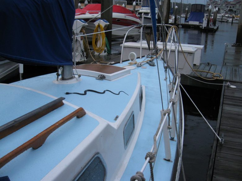 While initially tender she stiffens up promptly. The rigging is overbuilt and quite sturdy. I have replaced one shroud with a crack in the turnbuckle and removed the jib sheet blocks and tracks. She can take much more than I can. I have become a great admirer of Carl Alberg (He spent WW II in Charleston, S.C. designing landing craft) and the Pearson Brothers who built the boat when oil was $1.65 a barrel and laid on the glass. I’ve now owned her half of her 44 years and hope she’ll be around in 44 more.