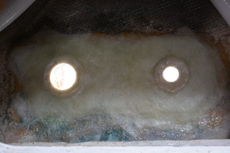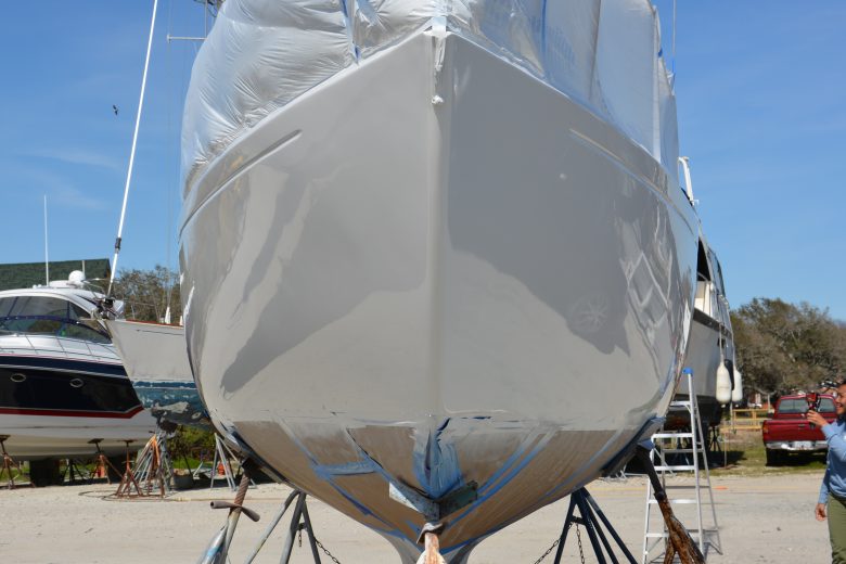 May, 2019 – The blisters were all below the waterline and the yard did not think they were a big deal. There were three that I could find that were into the fiberglass and they were low on the keel. I ground them out and filled them with thickened epoxy. This weekend, if the weather cooperates we will be applying Interlux Interprotect barrier coat and two gallons of VC Offshore antifouling, in red.