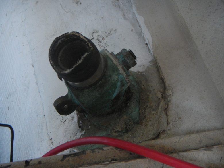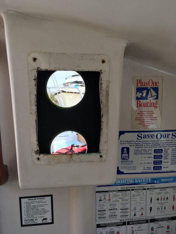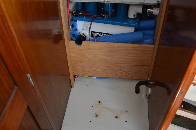 For the plumbing we had to get rid of a 3 gallon gas can “holding tank” arranged previously. Instead, decided to install an Electro Scan MSD type one sanitation device. We also added a new y valve so that we could do direct discharge when we are more than 3 miles offshore. We plan to have a small porta potty onboard for those rare times that we find ourselves passing through a No Discharge Zone, which unfortunately is the lower three counties of NC, guess we will not be sailing there very much. All the hoses were dry rotted and you can see picture of the galley sink thru hole where I just twisted the drain hose off. The scupper tubes were just as bad. Any of those would have eventually sunk the boat when they decided to fail.