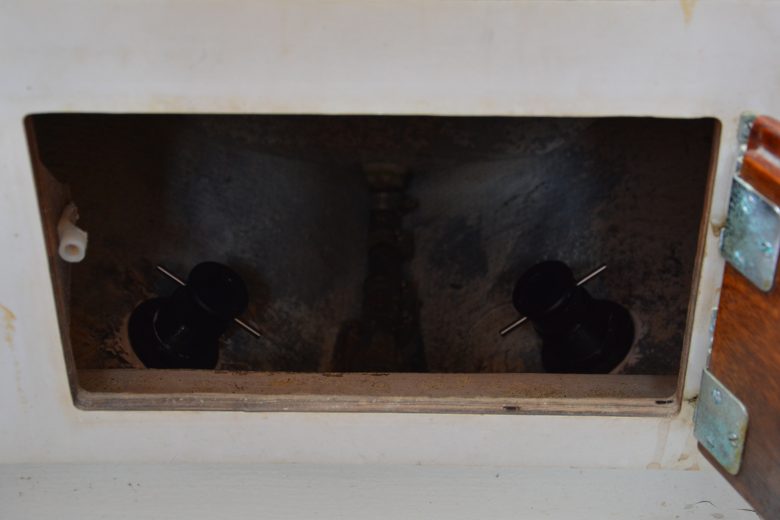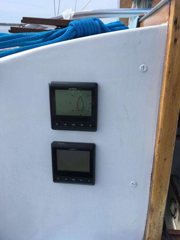 The last month was spent replacing the entire electrical system, all the instruments and the plumbing. The wiring was a mess, there were birds nests of random wires everywhere so it all had to go. I used the original electrical panel box to house my wind and depth gauges and sacrificed 6 inches of the depth behind the galley sink to make a “control center.” All the new instruments and the VHF are NMEA 2000 compatible so they all talk and share information. All the cabin lights and navigation lights were upgraded to LED and house battery bank was installed where an inboard engine would have been. The house bank gives me a total of 315 amp hours from 3 – 31 series AGM batteries. I added a 30 amp shore power connection that is hard wired to a dual bank battery charger so that it can charge the house bank and starter battery at the same time. The electrical stuff took 7 full days. I am not an electrician so I went slow and took it one circuit at a time with my wife reading me the directions. Unbelievably, everything worked as it should on the first test.