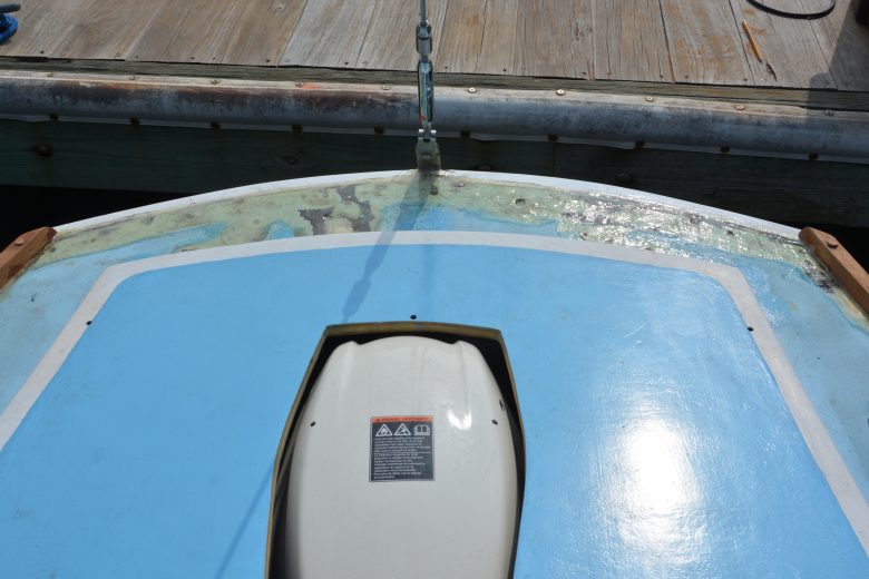 March, 2019 – Victoria Ann was hauled out at Anchors Away Boatyard on 25 February and since then we have spent a total of 12 days scrapping, sanding and painting the hull top and bottom all the way to the gel coat. Removing 52 years worth of paint showed a lot of history, old impacts that had been repaired, old through hulls that were patched and an old hailing port of Harwich Port, MA which doesn’t line up with the known history on the Bristol 27 site.