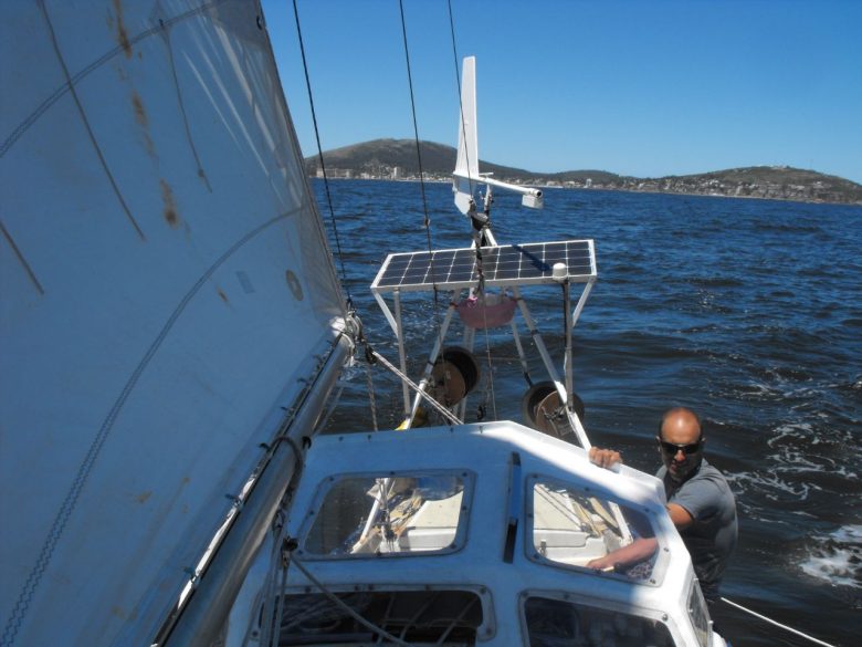 The boat was left in Piriapolis, Uruguay for six months, during which I went to Chile to work and make money for this adventure, upon my return my friend Mane and I found the boat in good shape, still standing right side up in the concrete compound of the port. Looking a little dirty and sun dried, but otherwise ok, we made a very quick (and sloppy) job painting the hull without even sanding it, and putting the acrylic windows on the cabin that I had made before leaving the boat the previous autumn. Without spending any extra time in the port, we went to the water and promptly out to sea.