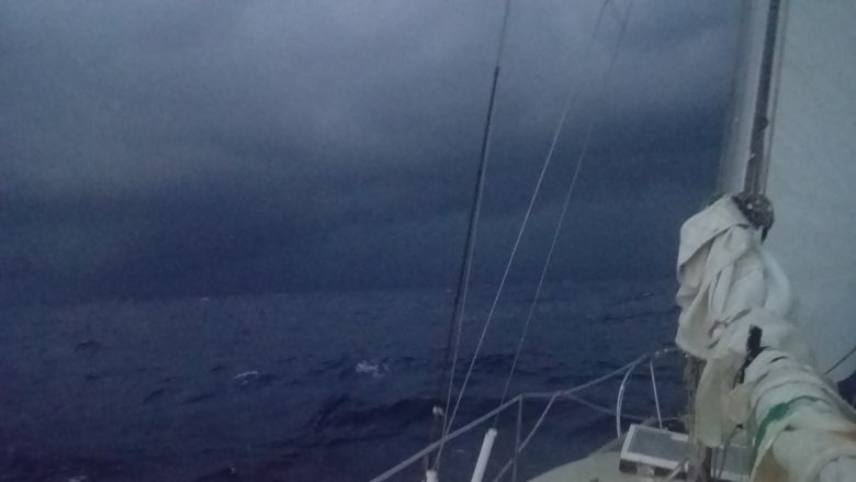Calm… wind shift, darkness and… Boom!!, the usual explosive irruption of the first violent squall, a sudden gust of wind that pushed rain as hard as bullets and, within seconds, had the ocean turned into a turmoil of confused waves that shaked the boat in all and no direction, while I pushed sails down as fast as possible getting tangled, as it happens, with my harness line on every little deck fitting, making movements clumsy and slow.