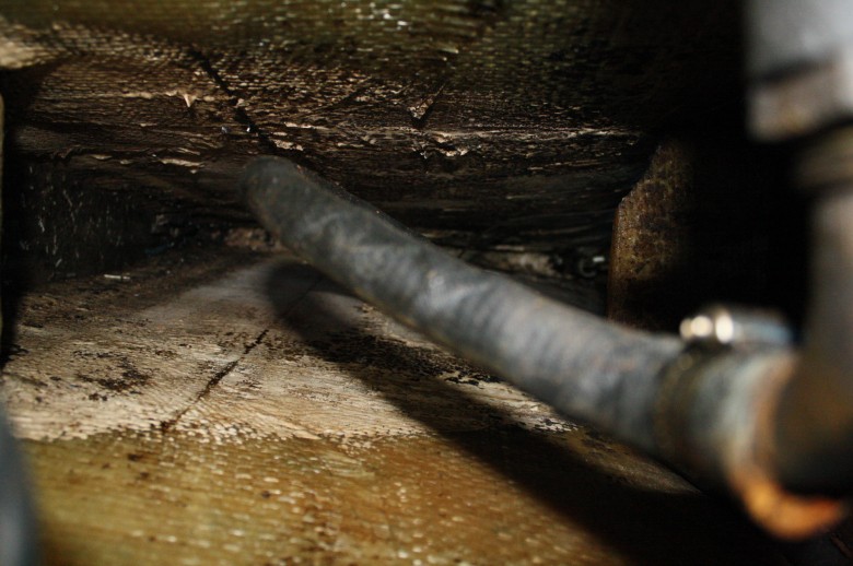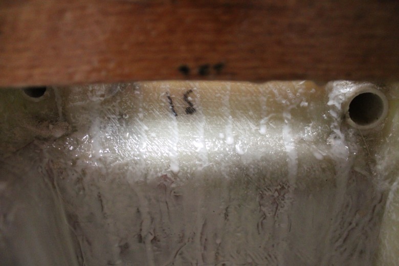 And speaking of locker drainage, this bilge area, plus the lockers that drain into the forward bilge (settees & below head) all drain via a 3/4″ PVC pipe. The pipe runs above the diesel tank, next to the lid flanges and eventually drains into the bilge. Originally, I had two different PVC pipes (a 3/4″ and 1/4″), but due to some errant epoxy work, I had to permanently seal the 1/4″ drain in the bilge area. Now, this 1/4″ pipe only drains the drip pan.