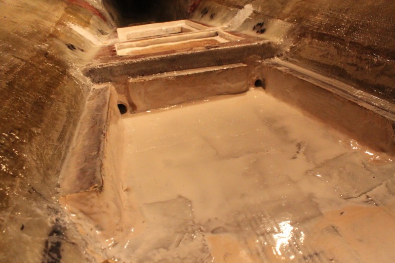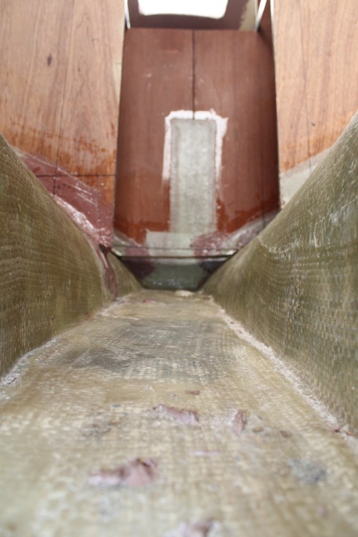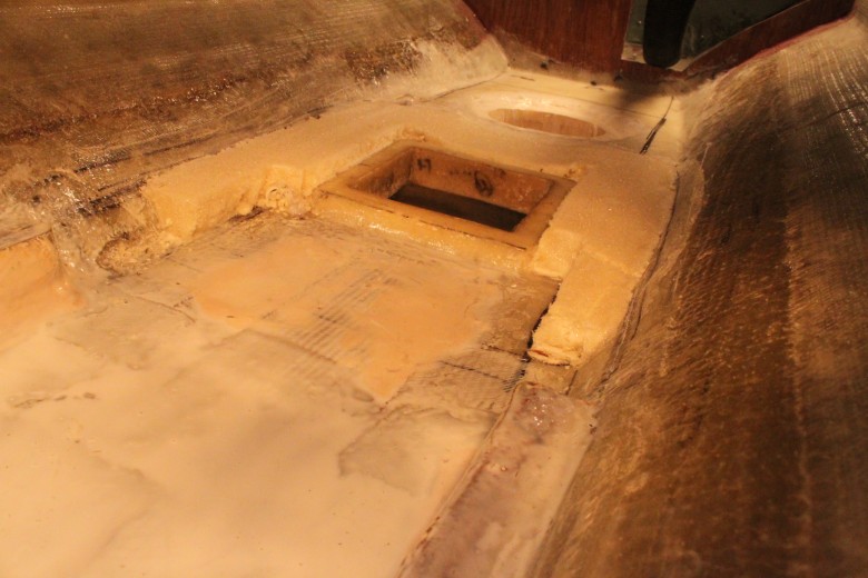 Overall, the construction of the new bilge essentially came “free” with the construction of the diesel tank sides, but I did glass in support cleats for an eventual shelf to hold the high capacity pump. I also installed the sump drain line into the bilge and also have glassed in a backing plate for the raw water seacock.