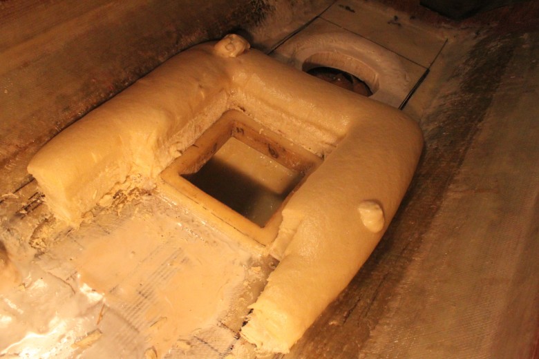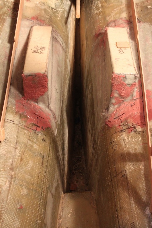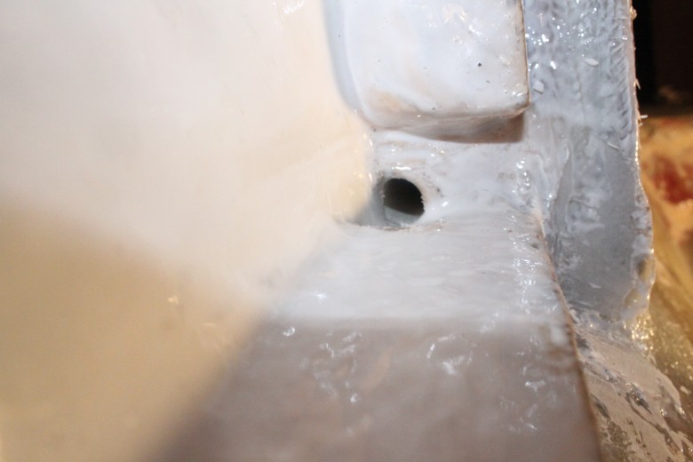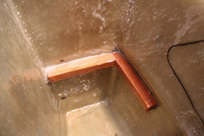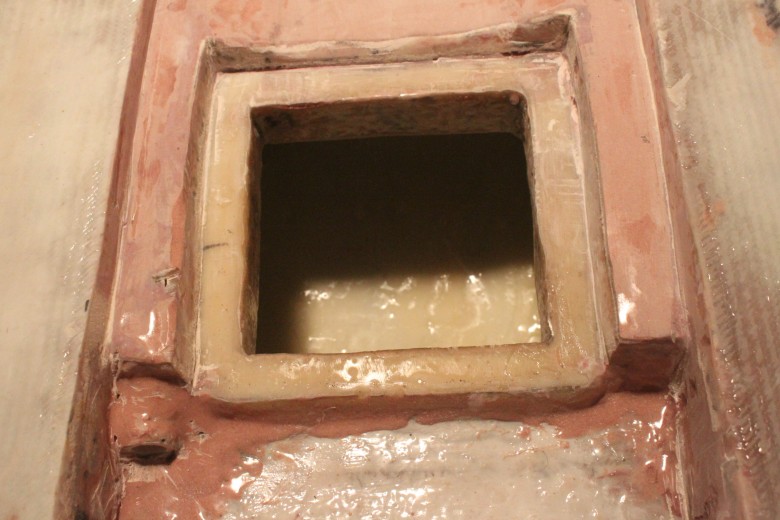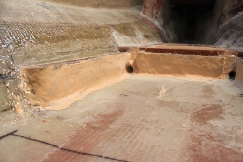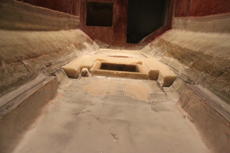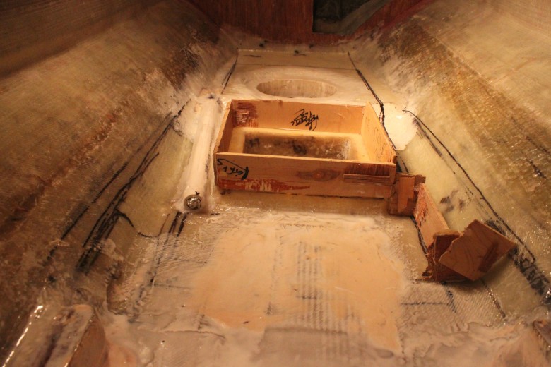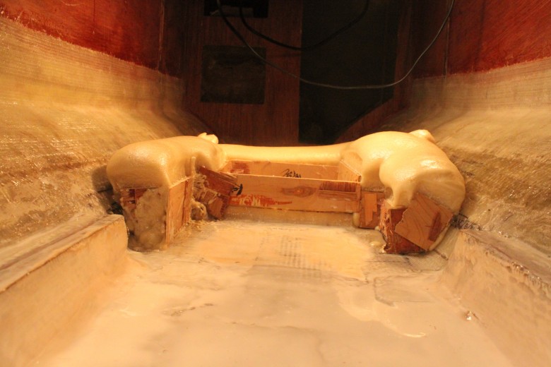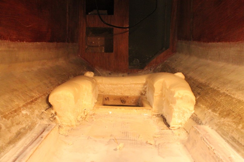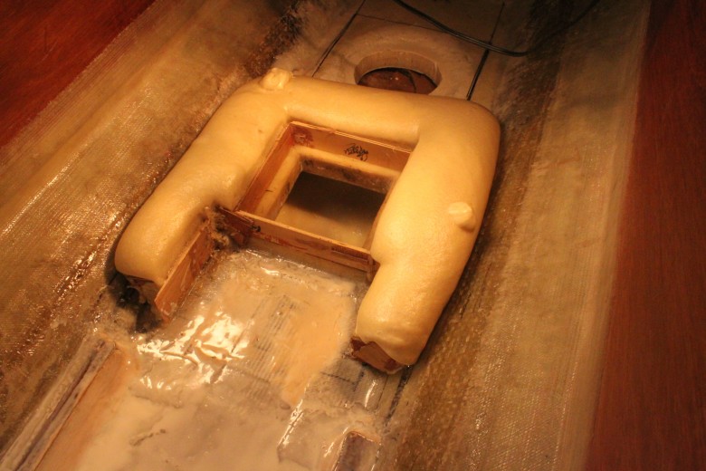 Recently, my focus has been on the bilge area above the diesel tank and below the cabin sole. Originally, I had envisioned this location as having a fair amount of space to store things like wine bottles or heavy anchors. As I began to add locker drainage, tank lids and the cabin sole, it became obvious that my idea of having below sole stowage was a futile one. Due to the futility of trying to gain just a few extra centimeters of stowage, I decided that I would foam in more of the bilge area. The extra foam would add some extra support for the sole as well as create better support for the below head locker drainage.