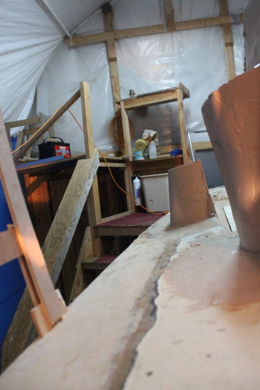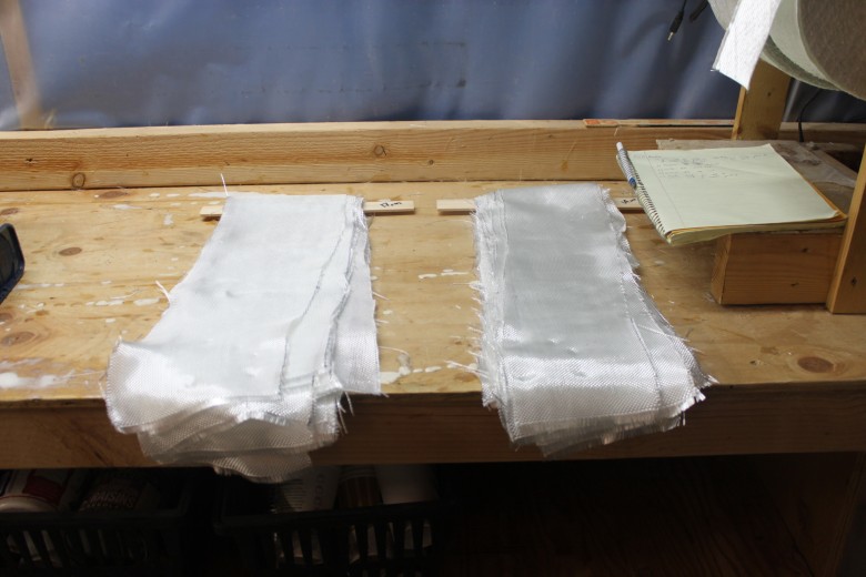 + Day 2 – Ben and I installed 1 toe rail today. I removed the fasteners I had installed the previous day, then inserted shims between the toe rail and the deck, allowing us to put 5200 caulking below the toe rail. Once the caulking was in place, I drilled the fasteners through the deck and Ben installed the nuts and washers below deck. Ben also cut all the glass for the toe rail layup using 2 layers of 7.5 oz cloth. One layer was 14cm, the second layer was 18 cm.