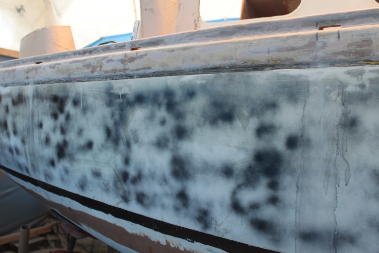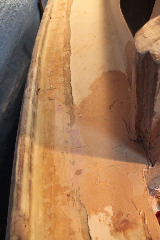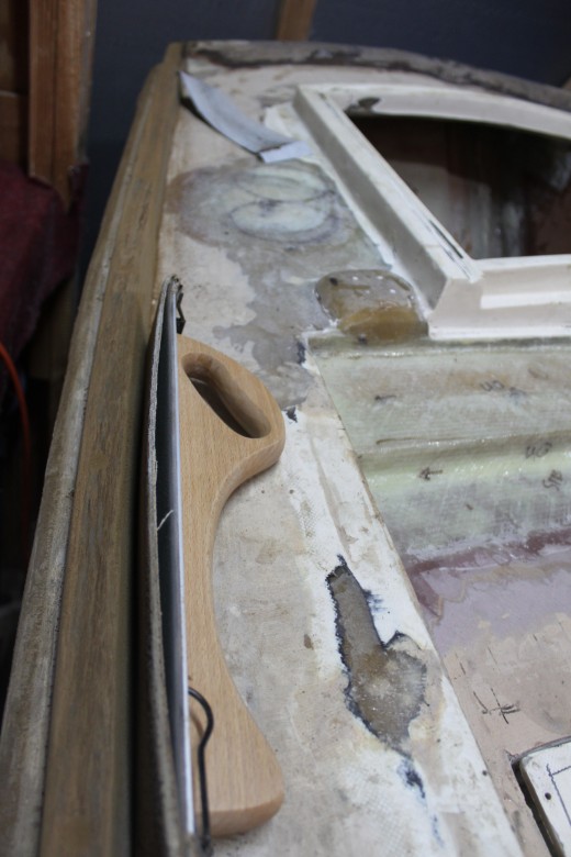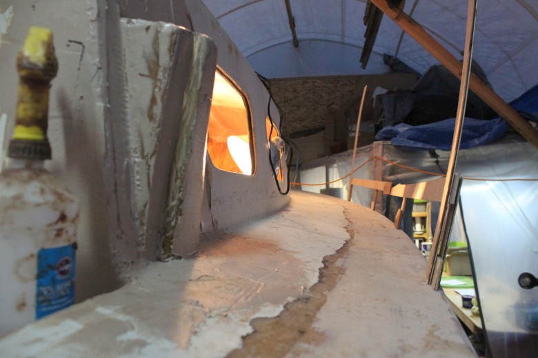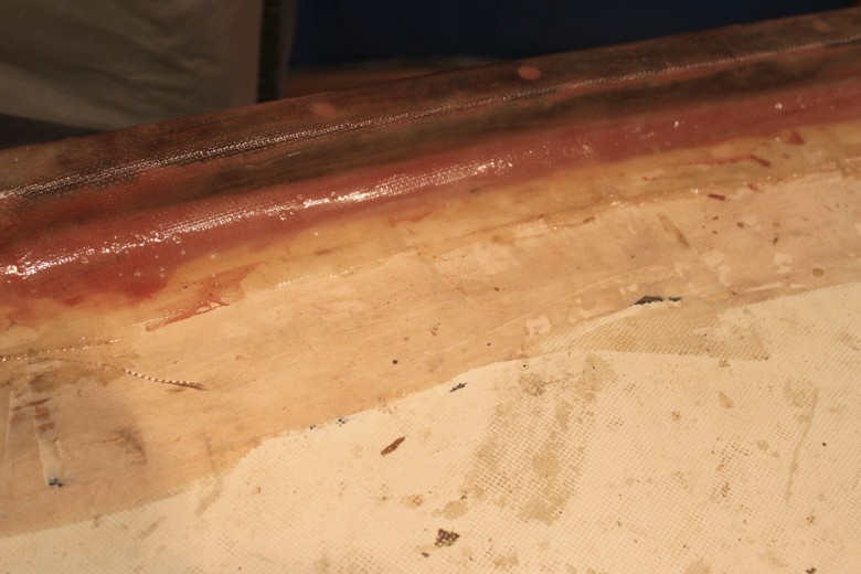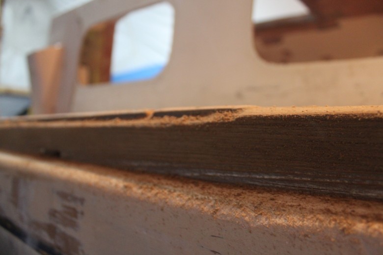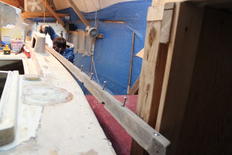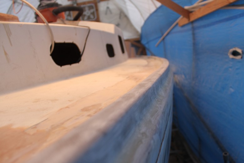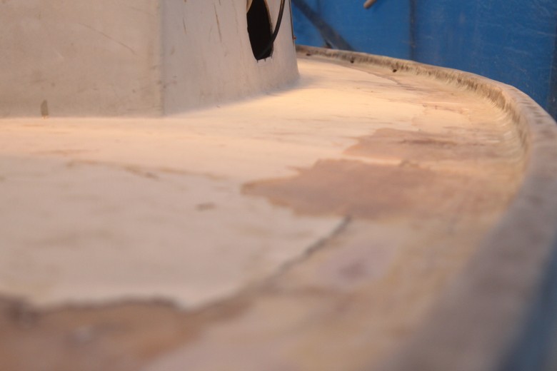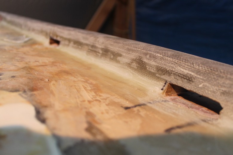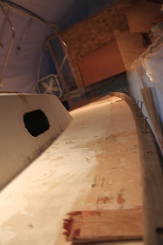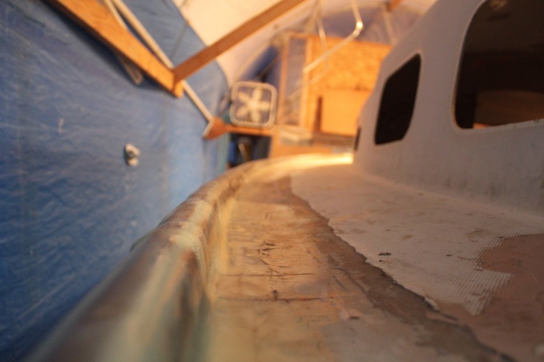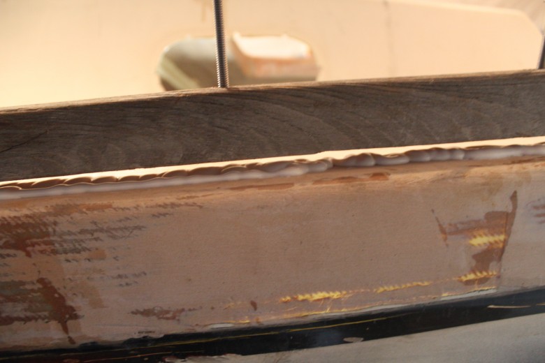 If you look down the port toe rail, you can see how the toe rail looks “bumpy” due to the unevenly spread epoxy thickener below