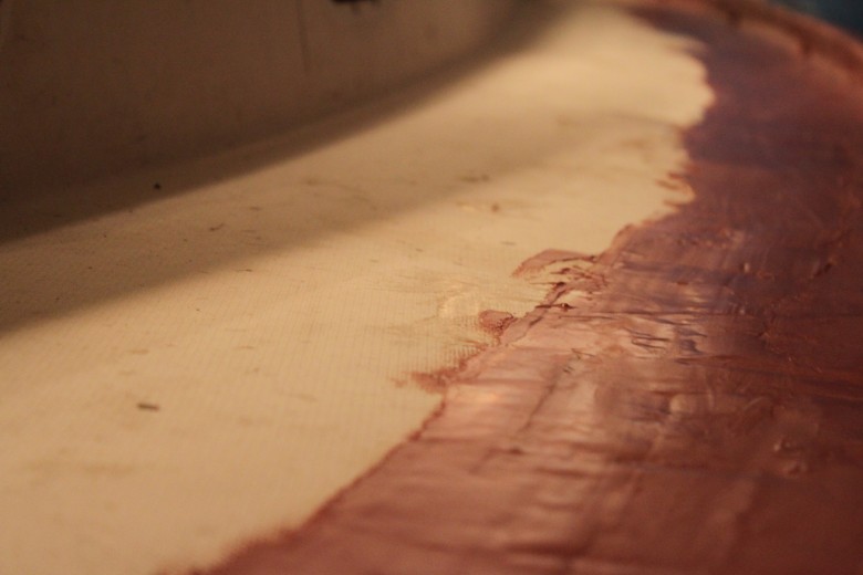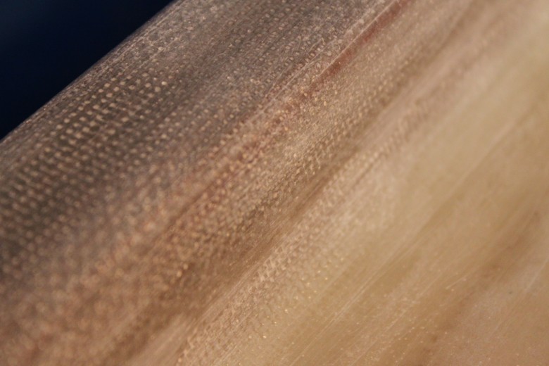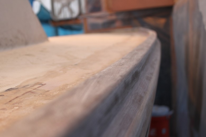 I spent the past weekend continuing my work on the toe rail. I faired the entire toe rail, plus the bow platform. Fairing was especially necessary, because when I first laid the fiberglass + filet, I found that the thickened epoxy filet had impressions underneath the thin, 14 oz. cloth. This resulted in what I can only describe as a “bumpy” toe rail. Here’s an image to explain what I mean: