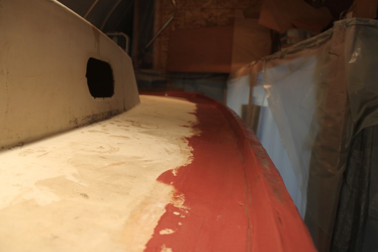 So, to solve this, I sanded the toe rail down as best I could. In some spots, unfortunately, I had to sand down through a layer of fiberglass. This isn’t ideal, because sanding through fiberglass layers essentially weakens the bond between the fiberglass, toe rail and deck, however there weren’t too many spots I needed to do this in. Once sanding was complete, I put on the first coat of fairing. I’ll definitely be hitting this fairing with some more sanding, plus another round of fairing/sanding or two, but overall I really liked how it turned out. See the first results of fairing below: