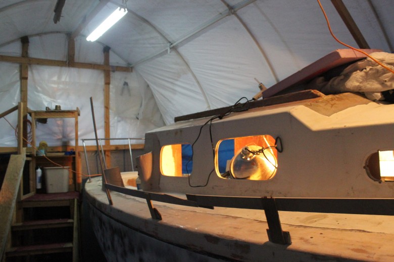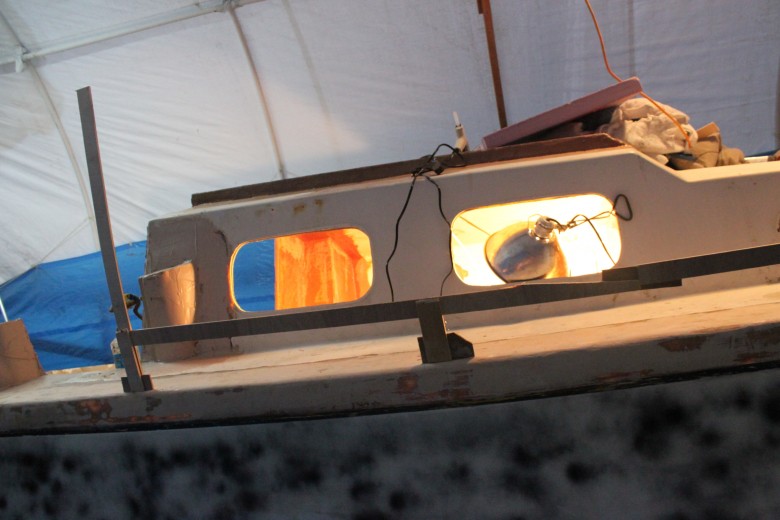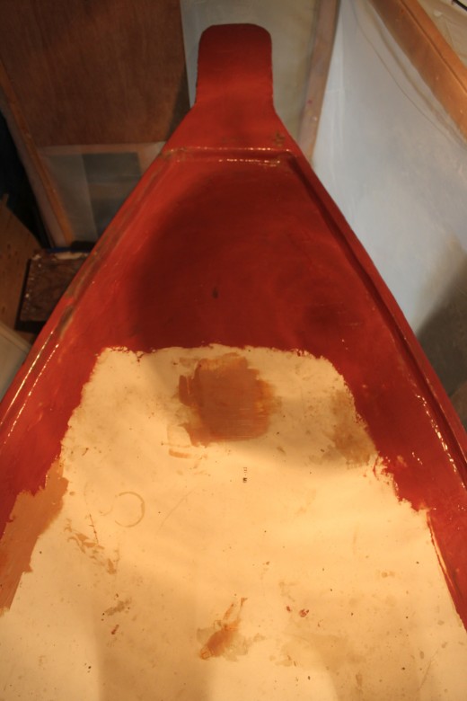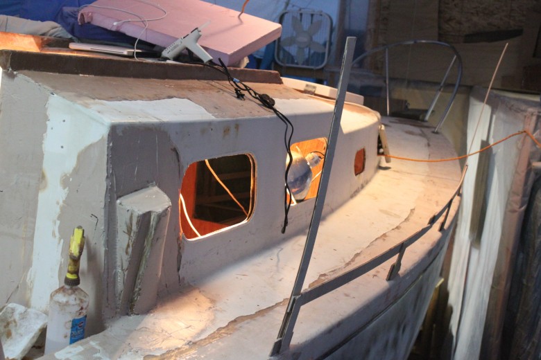 + Day 4 – This was a big fiberglass day. Ben helped me for a few hours and we installed the bow platform glass, plus the port toe rail. I finished up by glassing in the starboard and aft toe rail. I also made sure to install a block on the aft toe rail to mount a stern anchor roller.